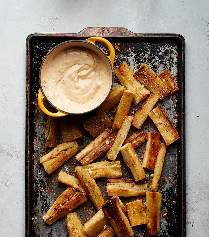 Sure, potato fries are great, but other starchy vegetables are also fry worthy. Yuca is a ubiquitous Caribbean tuber with a tough skin that makes it a challenge to peel. Frozen peeled yuca, sold at Latino markets and many supermarkets, is a better alternative. Here, wedges are roasted to golden perfection with a crunchy exterior, complimented by our chipotle aioli.